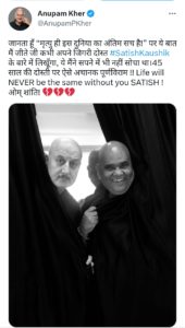 बॉलीवुड के मशहूर अभिनेता और जाने-माने डायरेक्टर सतीश कौशिक का निधन हो गया है. इस दुखद खबर की जानकारी जानकारी उनके करीबी दोस्त औऱ एक्टर अनुपम खेर ने ट्वीट करके दी. उन्होंने लिखा कि जानता हूं कि मृत्यु ही इस दुनिया का अंतिम सच है. लेकिन ये बात मैं जीते जी कभी अपने जिगरी दोस्त सतीश कौशिक के बारे में लिखूंगा, ये मैंने सपने में भी नहीं सोचा था